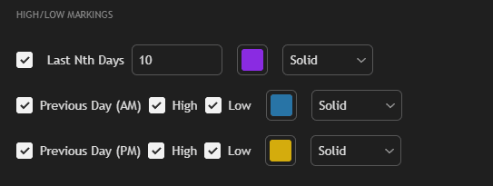 Previous Day (AM/PM): Highs and lows from prior trading sessions.