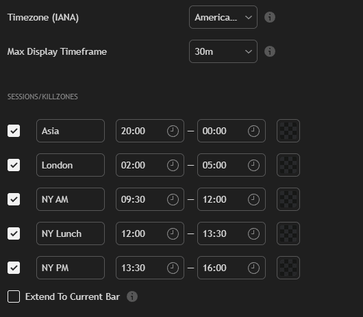 Purpose: Defines specific trading sessions—such as Asia, London, and New York—and highlights "killzones," periods of heightened market activity.