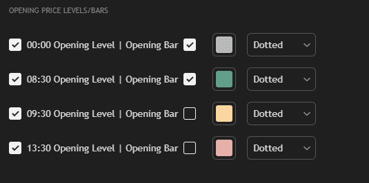 Purpose: Marks key opening prices at specific times (e.g., 00:00, 08:30).
