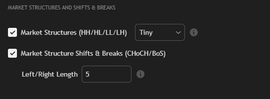 Purpose: Tracks key price swings, such as higher highs (HH), higher lows (HL), lower lows (LL), and lower highs (LH), as well as market structure shifts like Change of Character (CHoCH) and Break of Structure (BoS).